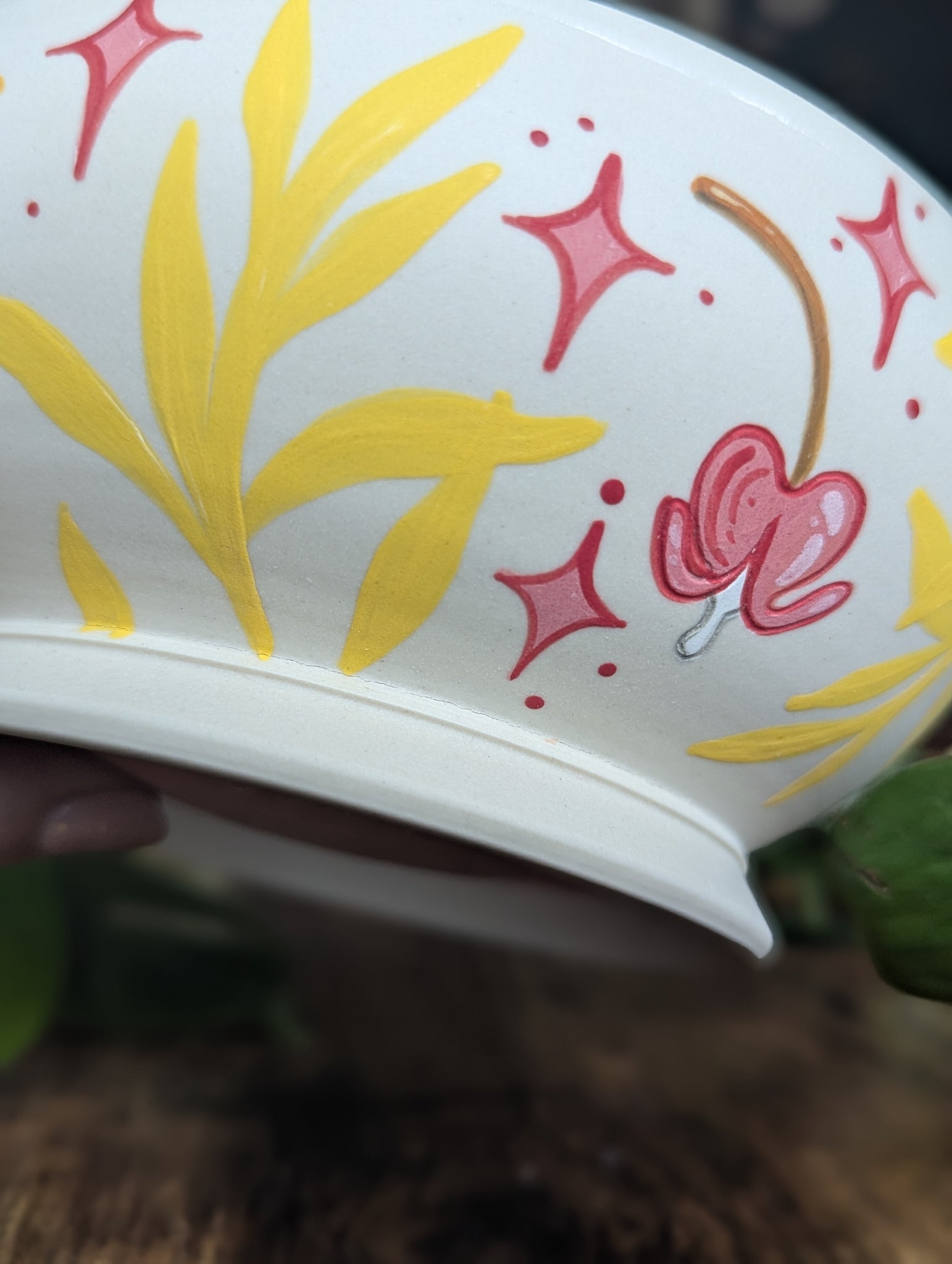 Wheel-thrown porcelain bowl with hand painted yellow beetle design with bleeding hearts, yellow leafy frame and pink and red stars.
