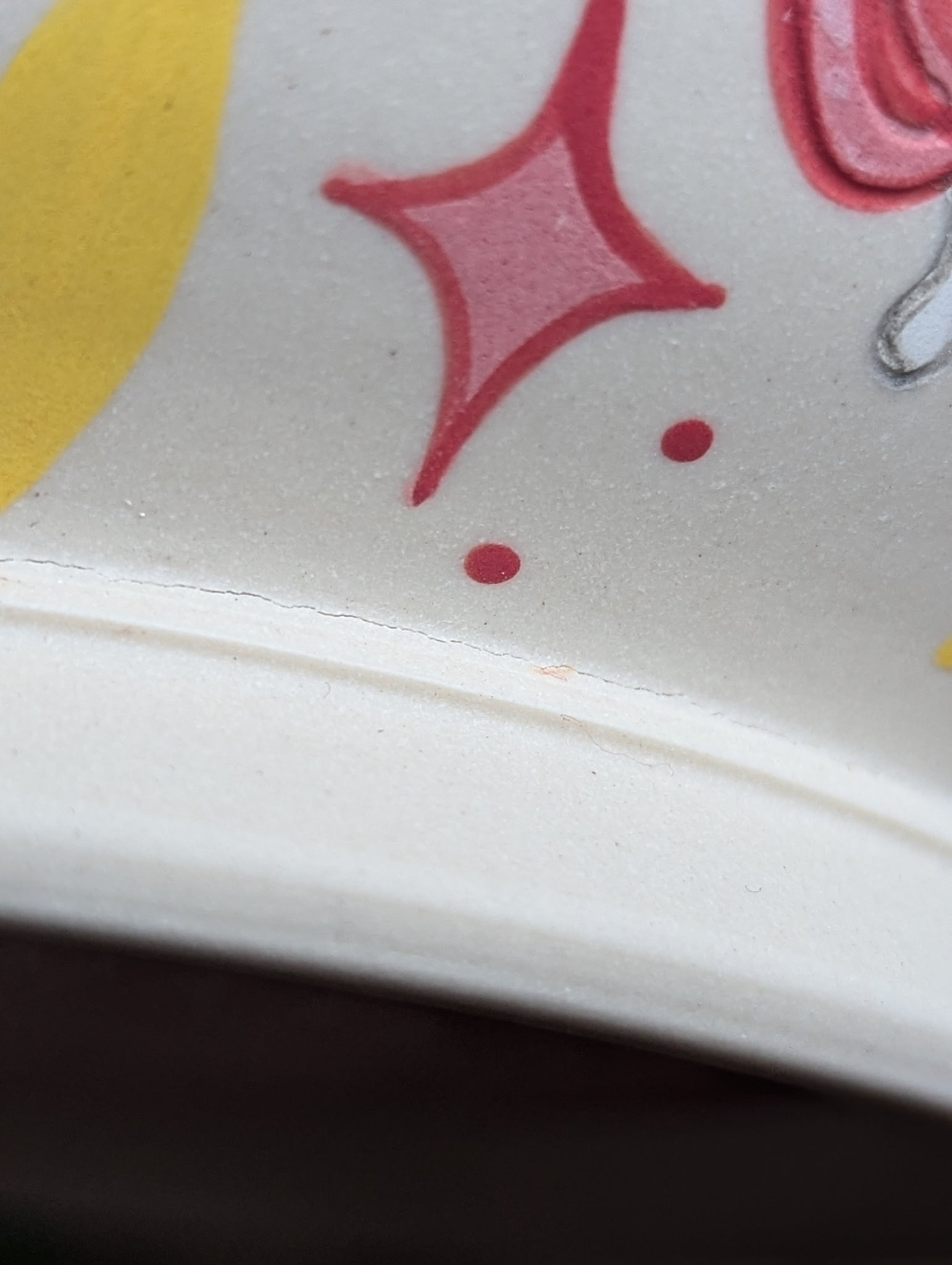 ** Food safe. Use in microwave and dishwasher with caution, as the crack is a potential weak point for more extreme environments like these machines. **